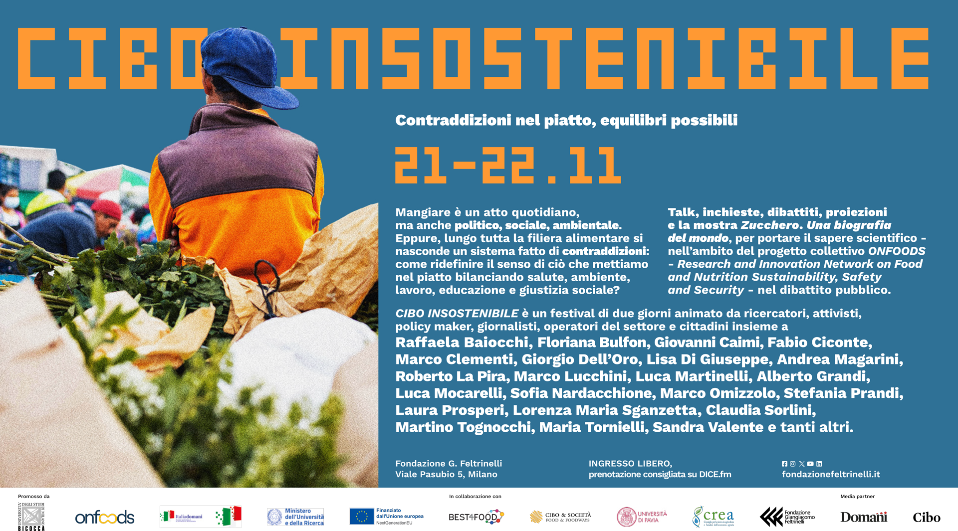 Di questi temi si parlerà a “CIBO INSOSTENIBILE. Contraddizioni nel piatto, equilibri possibili”, il nuovo festival promosso da Università degli Studi di Milano-Bicocca e Fondazione Giangiacomo Feltrinelli, in programma venerdì 21 e sabato 22 novembre 2025 in viale Pasubio 5, Milano.