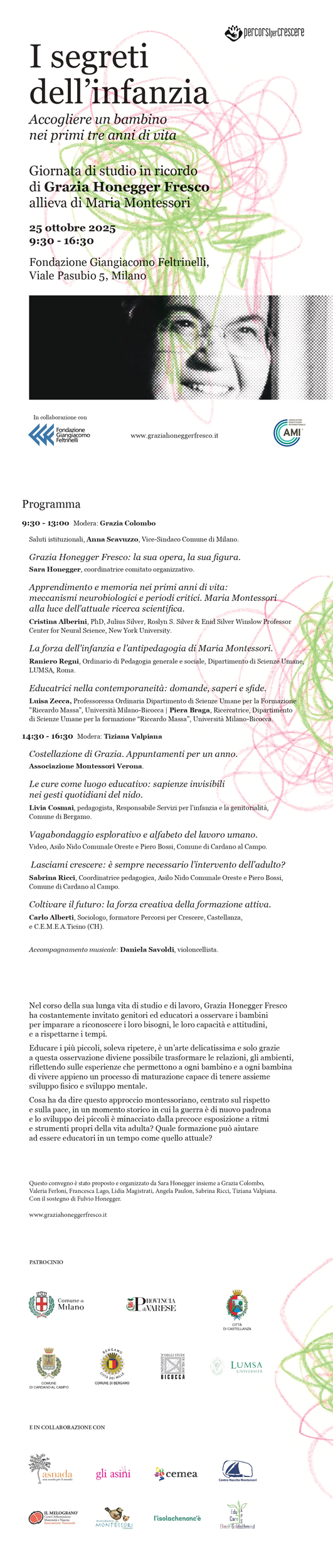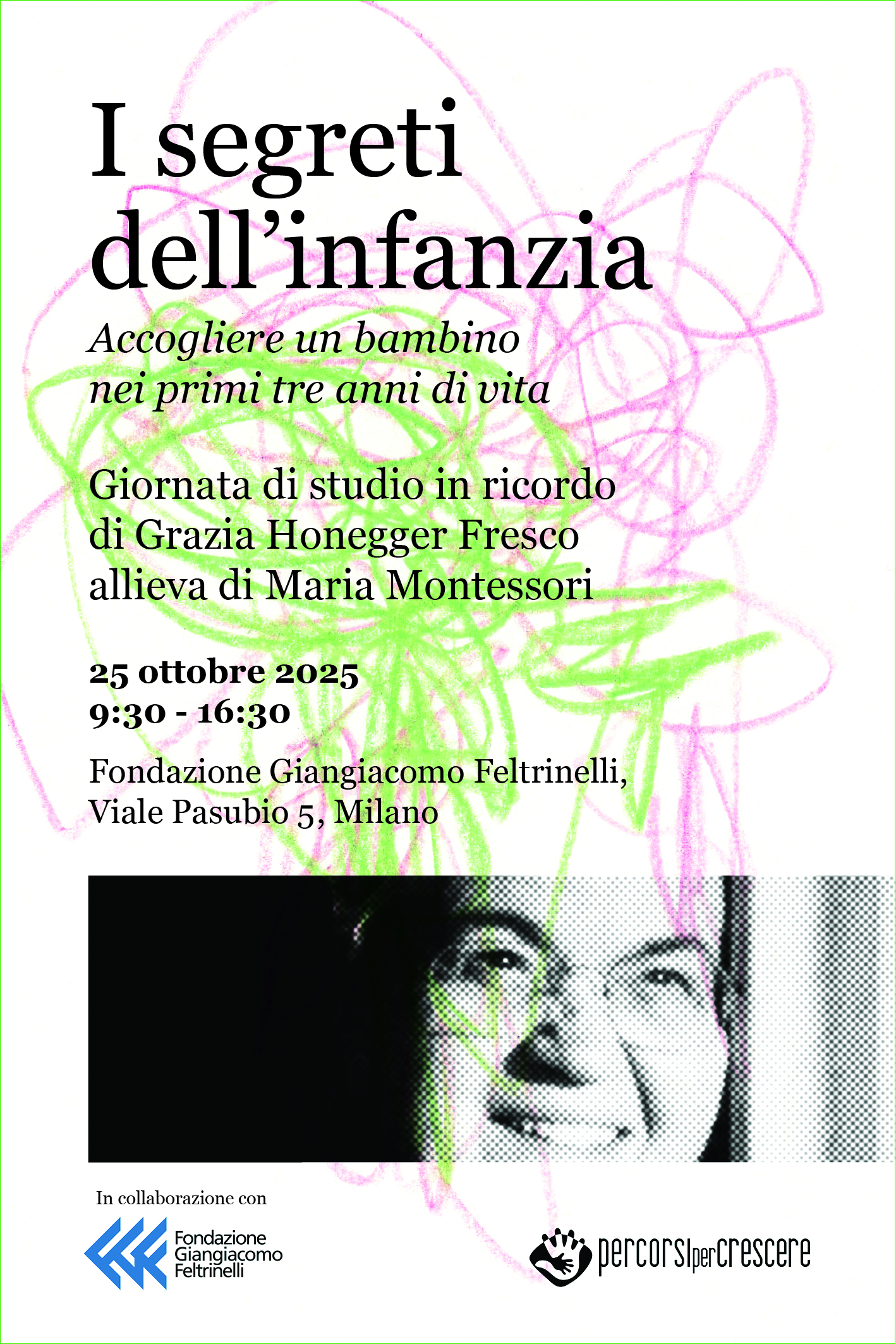 Grazia Honegger Fresco (www.graziahoneggerfresco.it), allieva di Maria Montessori, ha costantemente invitato genitori ed educatori ad osservare i bambini per imparare a riconoscere i loro bisogni, le loro capacità e attitudini, perché solo grazie a questa osservazione diviene possibile rispettarne i tempi di maturazione trasformando le relazioni, gli ambienti. In un momento storico in cui lo sviluppo dei piccoli è sempre più minacciato dalla precoce esposizione a ritmi e a strumenti propri della vita adulta, l’approccio montessoriano di Grazia, centrato sul rispetto e sulla pace, si confronta con la contemporaneità in una giornata di studi dedicata ai primi tre anni di vita, le fondamenta dell’essere umano.
