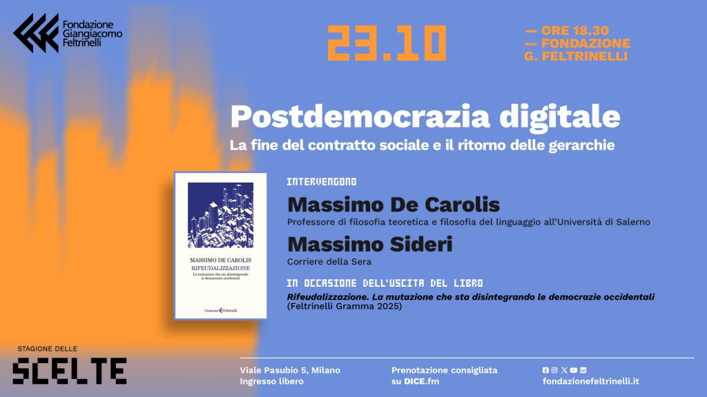 In occasione dell’uscita del libro Rifeudalizzazione. La mutazione che sta disintegrando le democrazie occidentali (Feltrinelli Gramma 2025) in cui Massimo De Carolis analizza il ritorno di dinamiche sociali simili al feudalesimo, dove potere pubblico e interessi privati si fondono minacciando la democrazia.