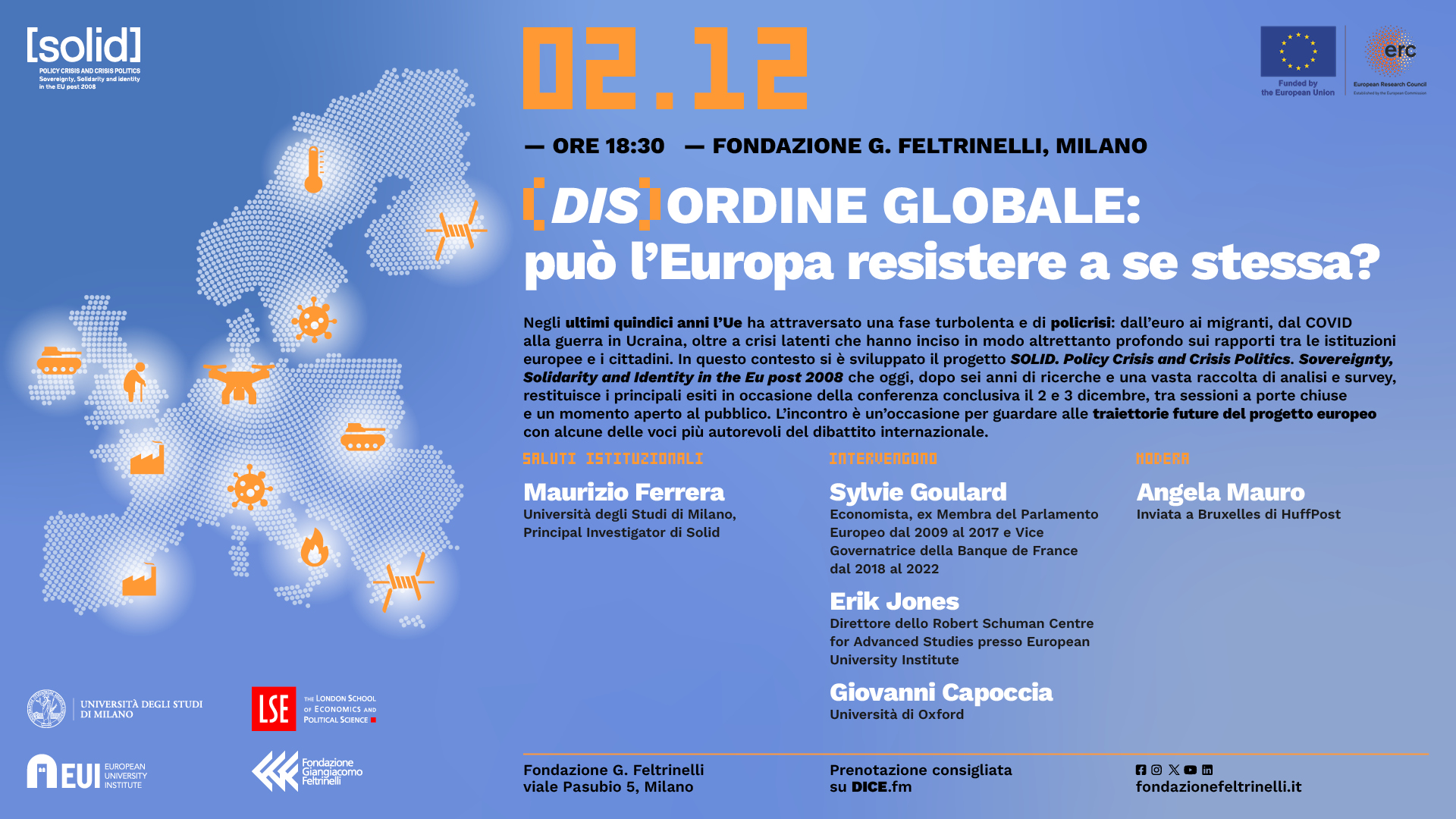 Dopo sei anni di ricerche (2019-2025) e una vasta raccolta di contributi scientifici, analisi e survey che restituiscono una mappatura dettagliata delle aspettative dell’opinione pubblica e dei meccanismi istituzionali e politici che hanno modellato la capacità dell’UE di rispondere alle diverse crisi in atto, il 2 e 3 dicembre si tiene la conferenza conclusiva presso Fondazione Feltrinelli, tra sessioni a porte chiuse e un momento aperto al pubblico.