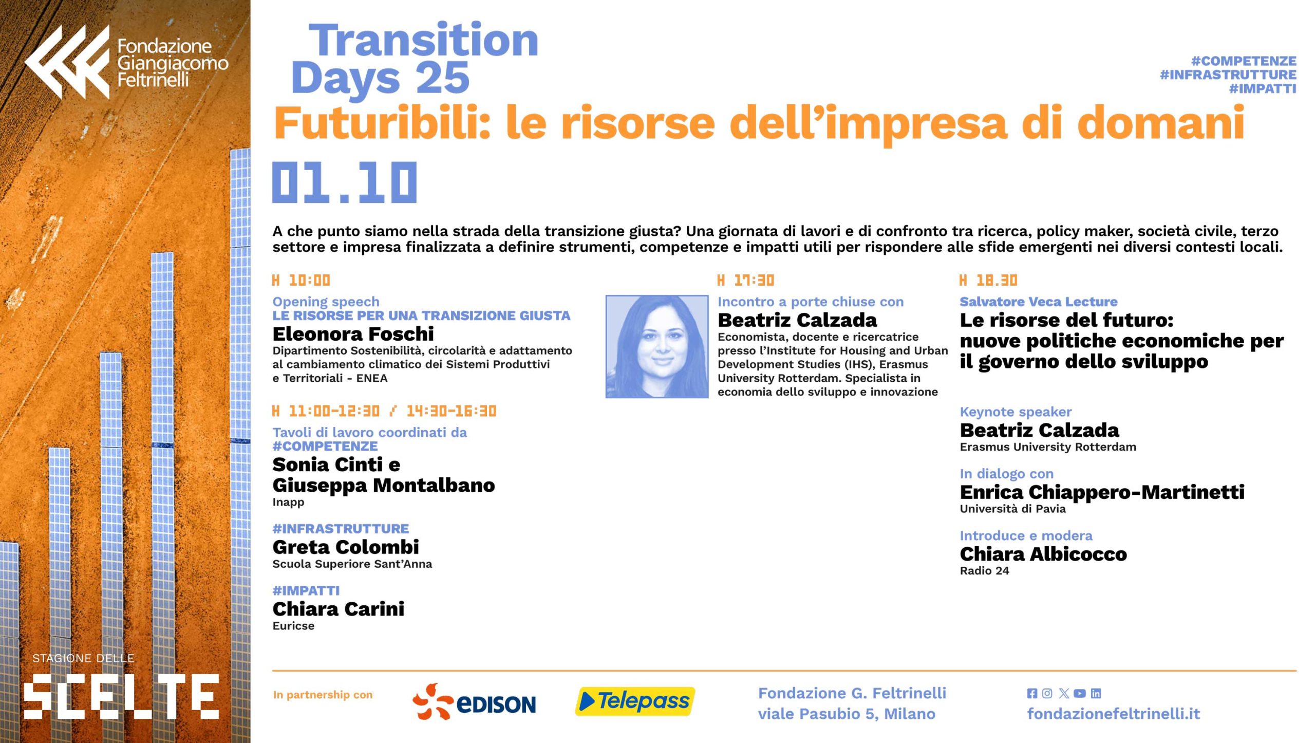 Questa edizione dei Transition Days 2025 esplora il tema delle risorse per una transizione giusta, in un contesto di ridefinizione delle catene del valore globale, urgenza di nuove competenze, crescente adozione tecnologica e riconversione produttiva.
