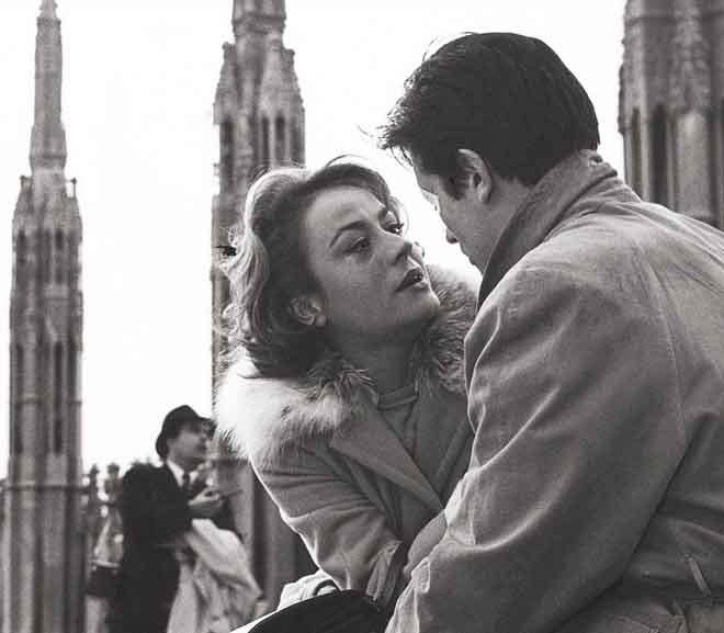La notte ci restituisce un’immagine di Milano assolutamente moderna caratterizzata da una geometria e da una razionalità fredda. È la scena iniziale a trasmettere questo mix di immagini. La macchina da presa sale sulla città seguendo l’elevatore di un edificio fino a darci il panorama complessivo della città e in cui il simbolo è il grattacielo Pirelli.